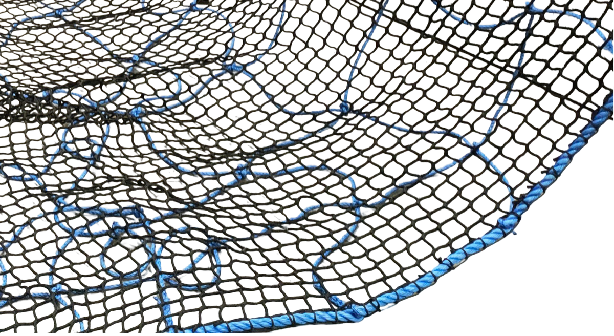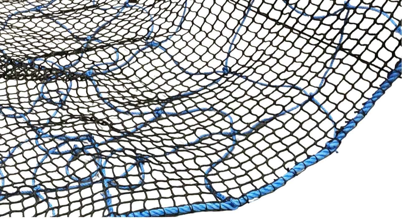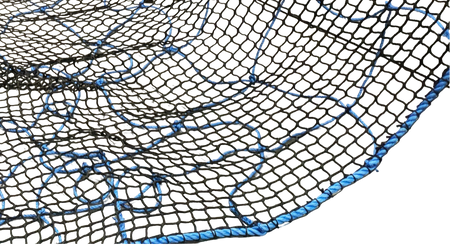 The 10m x 10m hoist net is manufactured with High Tenacity Polypropylene Rope. It has a 400mm mesh, a 18mm border rope, and one 20cm Lifting Loop in each corner. Additionally the net is overlayed with 45mm x 5mm black netting. This net utilizes a special splicing technique to join the rope ends and to join the net to the peripheral rope, making it stronger than a knotted join.