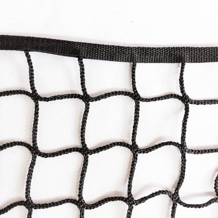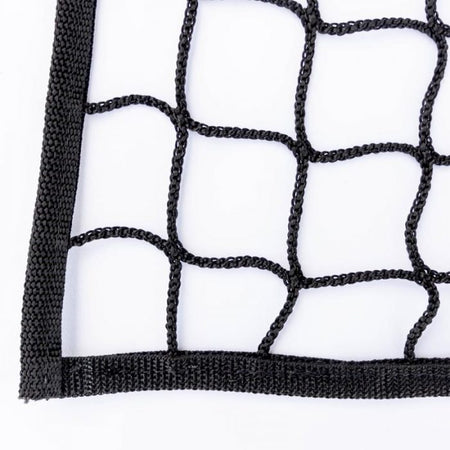 A Black Medium Duty Cargo Net 1.5m x 1.2m with 25mm webbing folded around the edge of the net. This helps to provide strength to the edge of the net and it also has a clean finish.