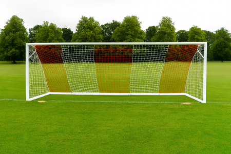 This 24ft x 8ft international-style football goal net features a two-colour vertical stripe design and is made from 4mm high-tenacity polypropylene with a 120mm mesh. Weatherproof, UV resistant and suitable for freestanding senior goals.