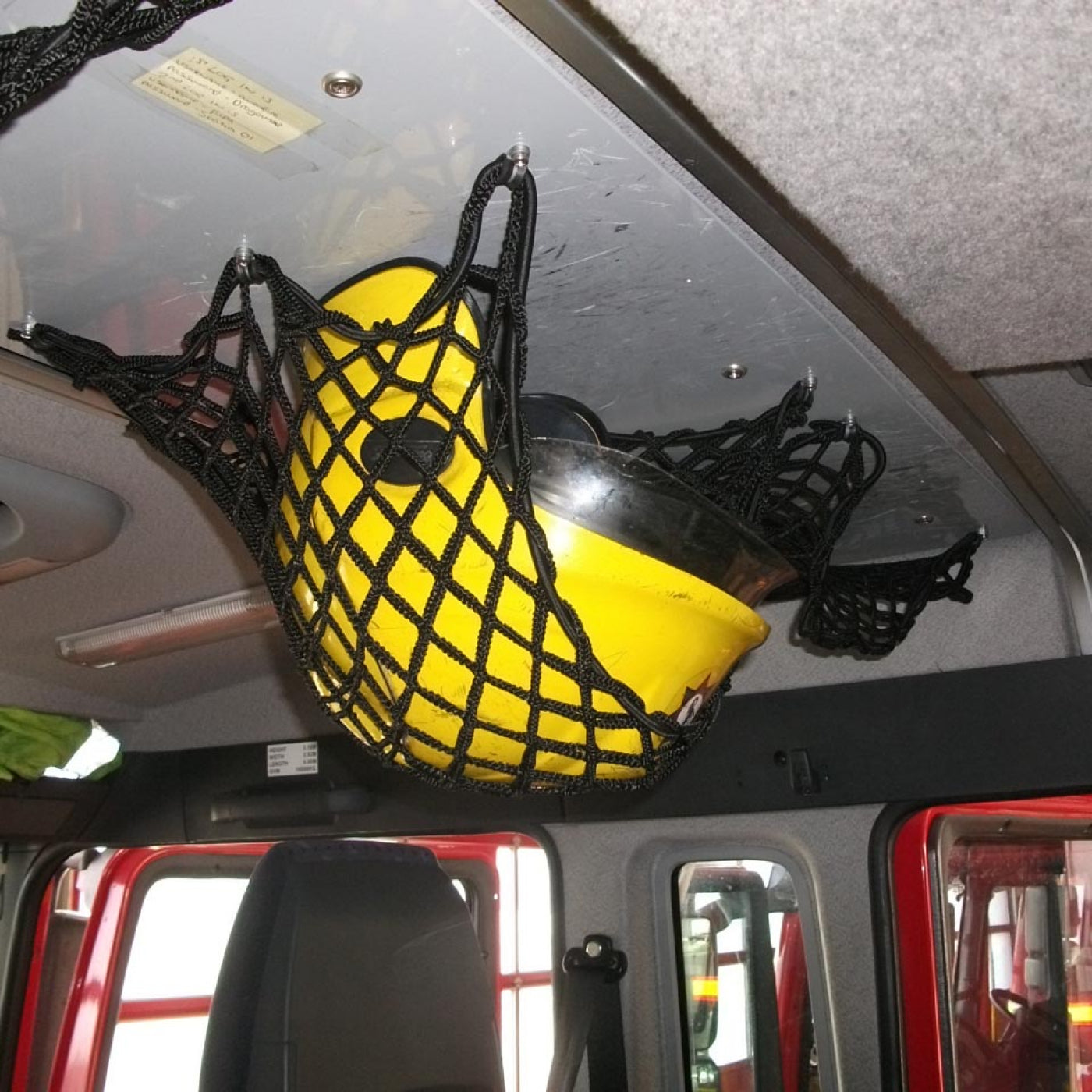 Nets4You developed an elasticated net with the ideal size and tension to both hold the helmet in place and allow easy access to it when required. This image shows one of the nets in use in the vehicle: