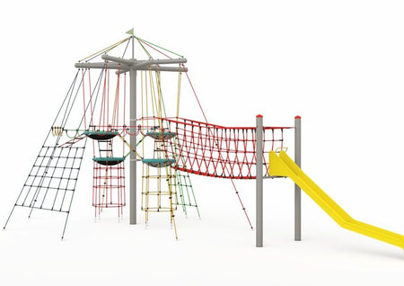 With a 6.2m tall central mast and multiple interconnected climbing elements, this play structure offers maximum engagement in a compact footprint. The addition of climbing chimneys, ropes and garlands allows for creative play while improving balance and coordination.