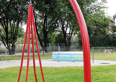 The 3.50m central steel post supports a suspended dish swing with a wooden base and ground anchor. Suspension chains with protective sleeves and a universal joint ensure smooth movement and secure installation.