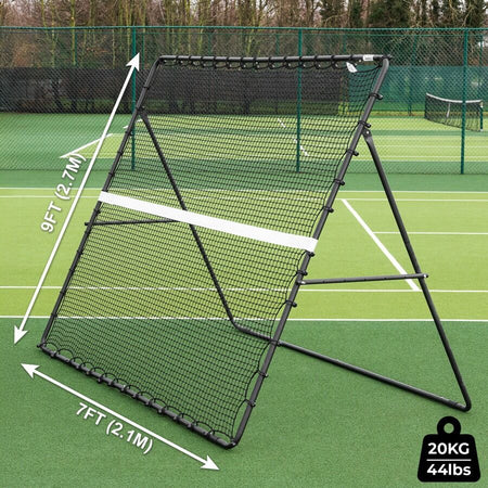A 9ft x 7ft freestanding tennis rebounder made with a powder coated steel frame and a 30ply twisted high density polyethylene net. Weatherproof and durable, it features four adjustable angles to vary ball trajectory. Supplied with net tape, bungee cords and a tensioner for set up, it is for players of all ages to improve their strokes indoors or outdoors.