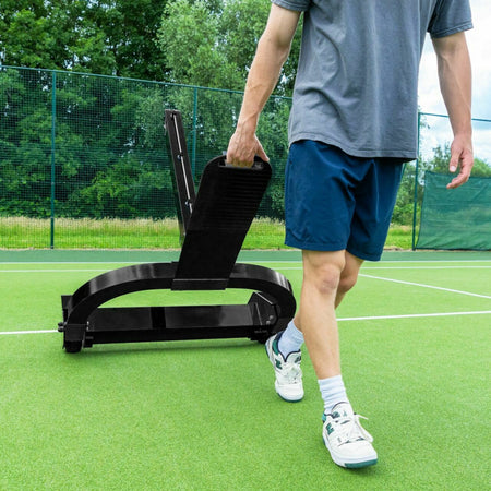 This self weighted mobile tennis post system allows you to set up a full sized professional court. Built with puncture proof wheels and aluminium posts, it is highly stable and designed for long term performance. Available in both singles (33ft) and doubles (42ft) regulation widths.